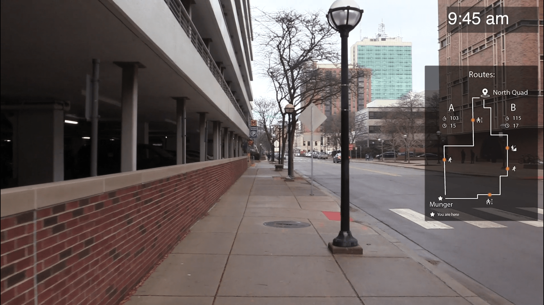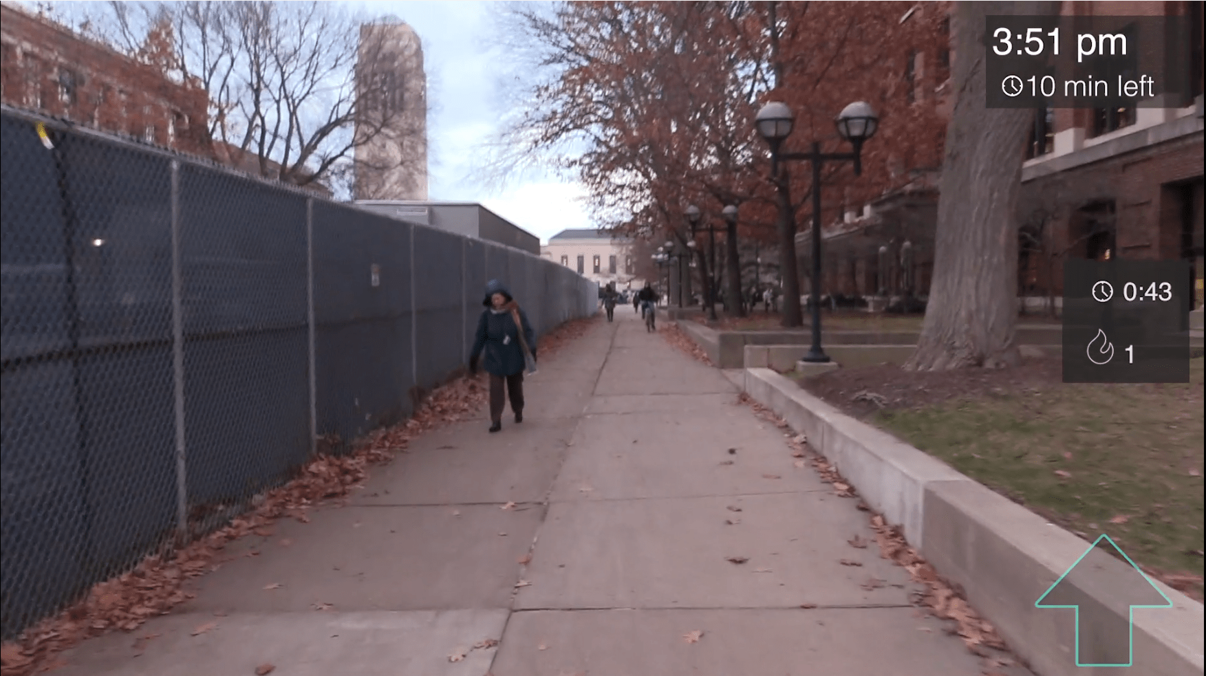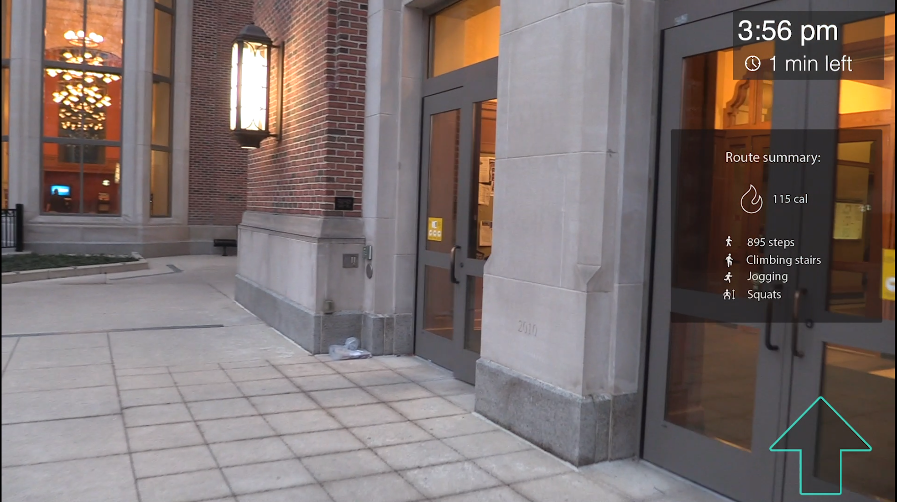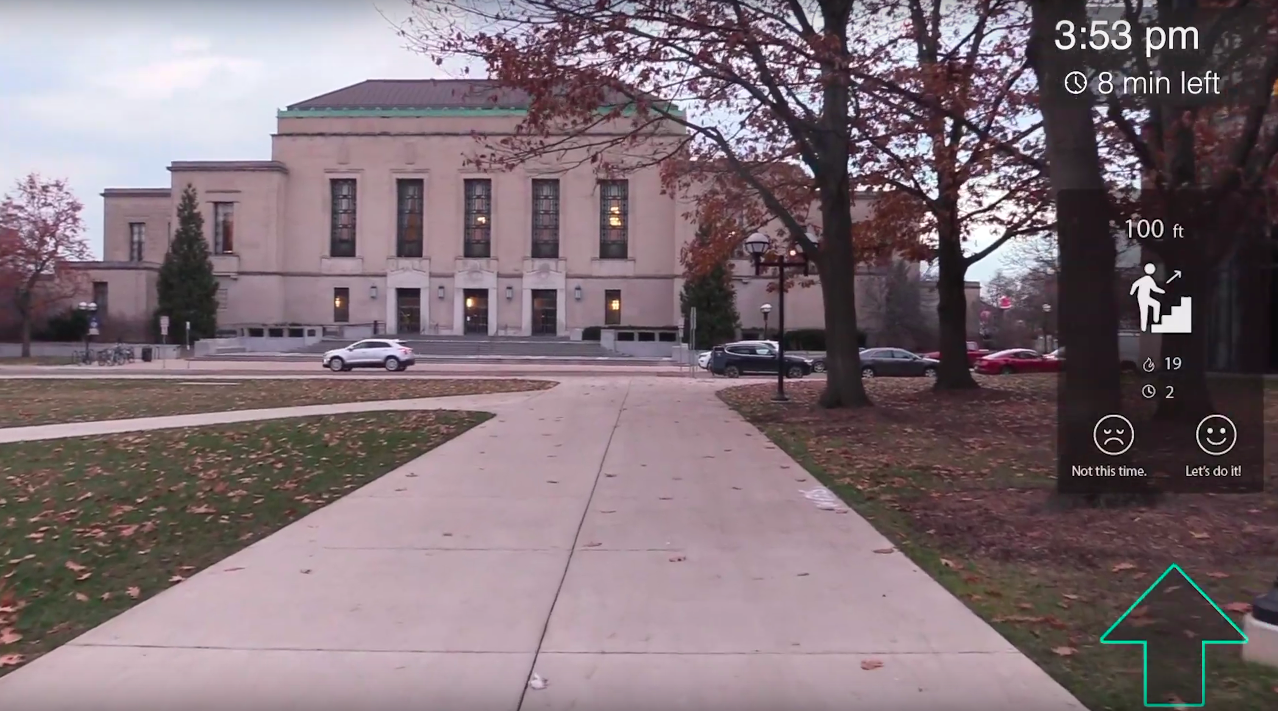 Instead of trying to force users into exercising, we present them with various choices as they walk, in this example, the glasses have detected some stairs and are offering them as a challenge to the user; while also displaying how many calories they’d burn and how long it would take